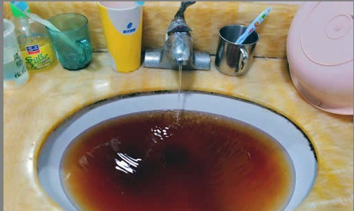 隨后,記者來到鮑先生家中,在衛生間的洗臉池中,有一盆黑褐色像醬油一樣的水。“這還是中午接的水,放在這里沉淀了這么長時間,顏色都沒變。”鮑先生說,由于前天上夜班,他休息到昨天中午才起床。鮑先生本準備洗漱做飯,一開水龍頭卻嚇了一跳,流出來的水又黃又渾濁,他只能用家里剩下的一點涼開水刷牙。“從發現自來水變色到現在幾個小時了,水還是臟的,也不知道是啥原因。”鮑先生當著記者的面打開水龍頭,自來水水流很小,而且依然是黑褐色的。